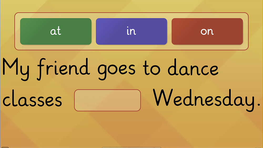 Un joc logic unde elevii aleg prepozițiile corecte precum "in", "on" sau "at" în contexte reale. Cu enunțuri despre activități desfășurate în diferite momente ale zilei, ale săptămânii sau ale anului, copiii exersează gramatica într-un mod plăcut și eficient, dezvoltându-și intuiția în limba engleză.