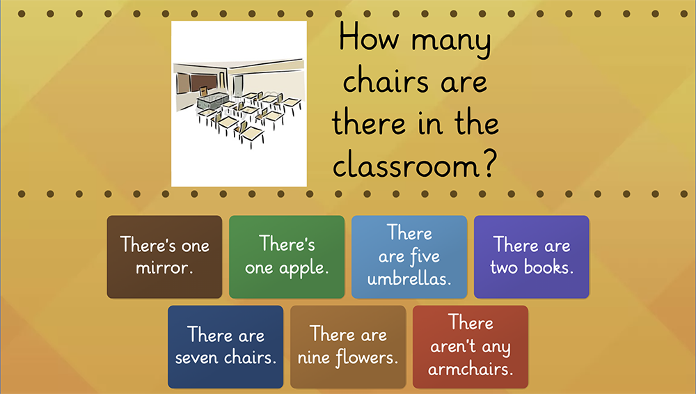 Exersează structurile "There is" și "There are" într-un joc interactiv în care trebuie să alegi răspunsul corect la întrebări precum "How many books are there on the desk?". Un mod excelent de a consolida formularea întrebărilor și a răspunsurilor în limba engleză.