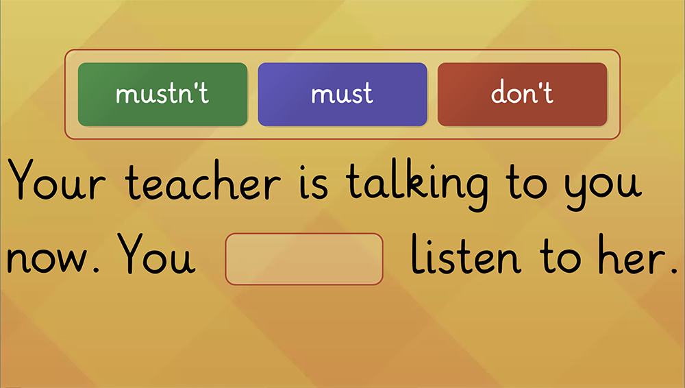 Testează-ți cunoștințele într-un joc interactiv despre regulile clasei folosind "must", "mustn't" și verbe la modul imperativ. Găsește cuvântul lipsă și verifică dacă știi care sunt regulile la școală și în clasă. Învață și distrează-te simultan!