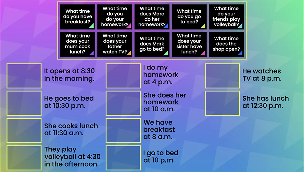 Potrivește întrebările de tipul "What time do you...?" și "What time does he/she/it...?" cu răspunsurile corecte și consolidează-ți noțiunile legate de folosirea prezentului simplu învățate în lecția anterioară. Jocul interactiv oferă exemple legate de activități zilnice care le sunt familiare copiilor și dezvoltă înțelegerea structurii întrebărilor și a răspunsurilor într-un mod prietenos.
