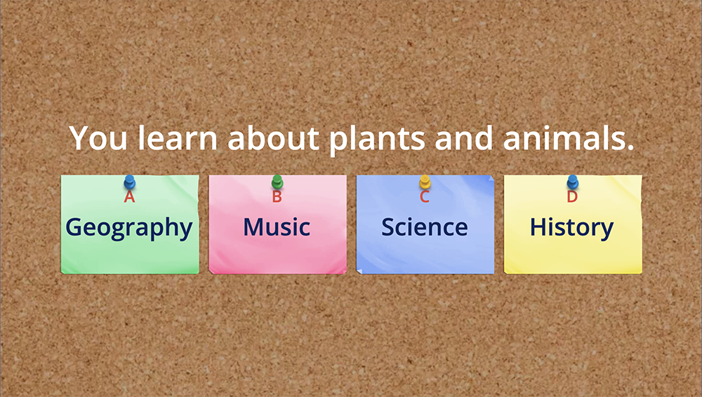 Testează-ți cunoștințele despre materiile școlare într-un joc distractiv în care trebuie să alegi răspunsul corect la întrebări despre matematică, geografie sau educație fizică. Activitatea este ideală pentru a-ți îmbogăți vocabularul în engleză într-un mod eficient.