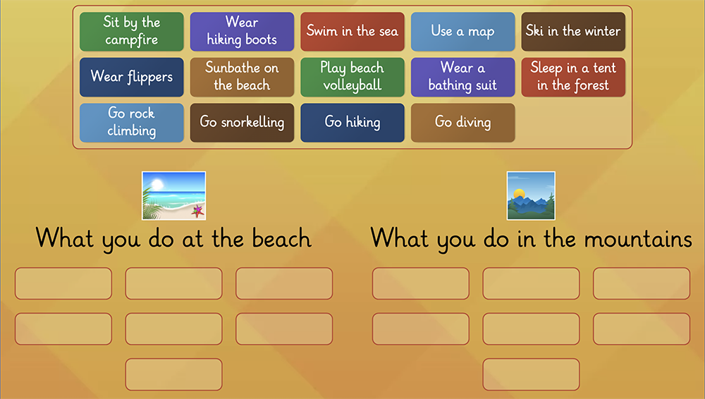 Testează-ți vocabularul legat de vacanță în acest joc interactiv. Sortează activități precum "go snorkelling", "sunbathe on the beach", sau "go hiking" în funcție de locul în care le practici, la mare sau la munte. Jocul te ajută să-ți organizezi vocabularul în engleză într-un mod logic și intuitiv.