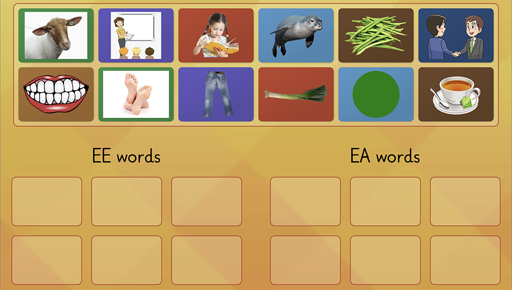 Joc interactiv pentru recunoașterea sunetelor "ee" și "ea" în engleză, într-un mod captivant, asociind imagini cu sunete corespunzătoare. Această activitate îi motivează pe copii să-și testeze abilitățile de a recunoaște grupuri de sunete. Jocul este distractiv și antrenant, potrivit pentru o testare rapidă și eficientă.