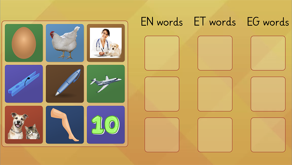 Testează-ți cunoștințele despre sunetele "en", "et" și "eg" într-un mod amuzant. Jocul interactiv te provoacă să potrivești imaginile cu sunetele corespunzătoare. Excelent pentru a-ți verifica și îmbunătăți rapid vocabularul și pronunția în engleză.