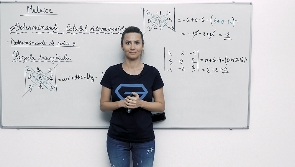 Regula triunghiului în calculul determinanților de ordin 3 sunt abordate într-un mod atractiv. Vei învăța să identifici triunghiurile cu baza paralelă cu diagonala principală și secundară și să folosești adunări și scăderi de produse fără a trasa linii. Două exemple practice demonstrează cum regula triunghiului oferă o alternativă rapidă și vizuală la Sarrus pentru determinanții de ordin 3.