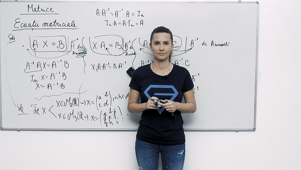 Tratează anumite ecuaţii matriceale de forma A·X=B sau X·A=B, cu ajutorul inversei: Învaţă cum să înmulțești ecuația în stânga sau în dreapta cu A-1 ,obținând astfel egalitatea X=A⁻¹·B, respectiv X=B·A⁻¹ folosindu-te de proprietăţile inversei. Lecţia explică clar când poţi aplica metoda şi paşii de calcul pentru obţinerea necunoscutei X, cu exemple concrete, ca să fii rapid şi sigur la examen.