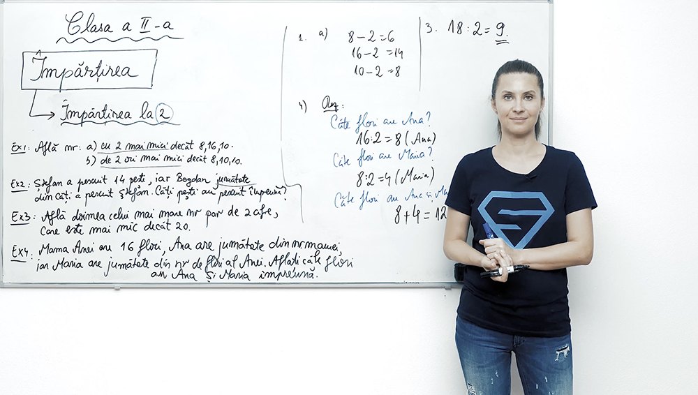 Învață împărțirea la doi ca pe o jumătate dintr-un număr, aplicând-o pe numere pare până la 20. Lecția video prezintă tabla simpla a împărțirilor la doi și asociază fiecare împărțire cu expresia "jumătatea numărului". Copiii descoperă rapid că împărțirea la doi înseamnă "de două ori mai mic", prin exemple ușor de reținut și captivante.