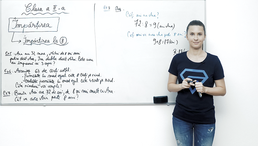 Exerciții cu probleme text care pun în practică împărțirea la 8 prin situații reale cu mere, cărți și vârste. Vei învăța cum să găsești câte fructe sau cărți rămân și câți ani va avea Ana peste opt ani. Lecția îți arată pas cu pas operațiile de împărțire, înmulțire și adunare, pentru a dezvolta abilități de rezolvare rapidă și precisă.