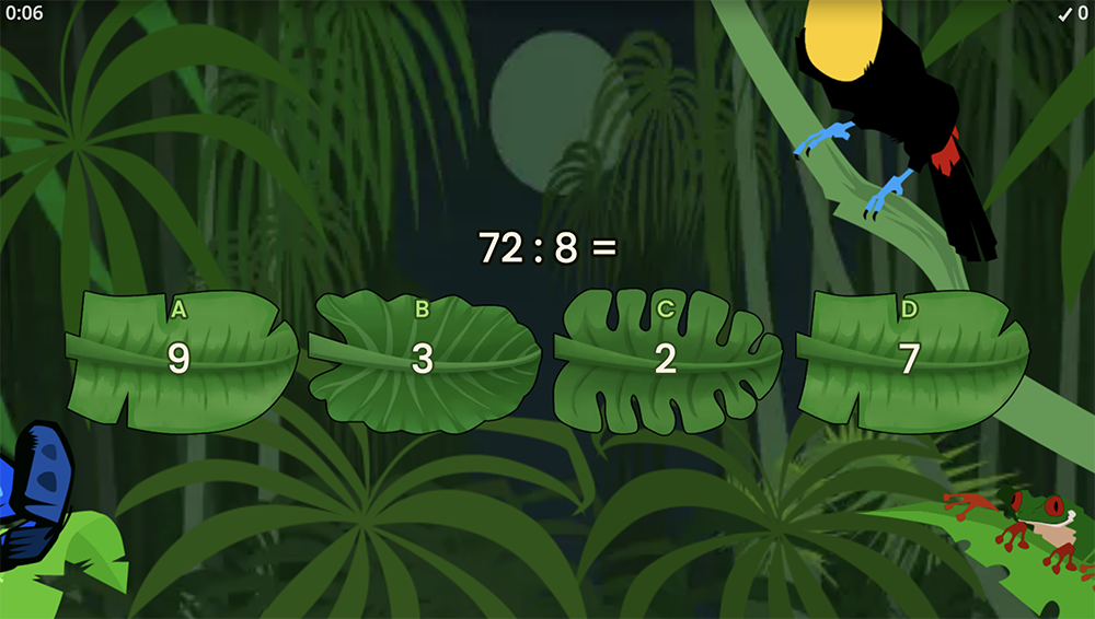 Joc interactiv pentru îmbunătățirea deprinderilor de împărțire la 8 într-un mod distractiv. Copilul va potrivi câtul potrivit pentru 32:8, 48:8, 72:8 și alte exemple, confruntându-se cu provocări adaptate nivelului. Jocul include ilustrații vesele și feedback imediat pentru a motiva și a consolida rapid înțelegerea conceptului de împarțire.