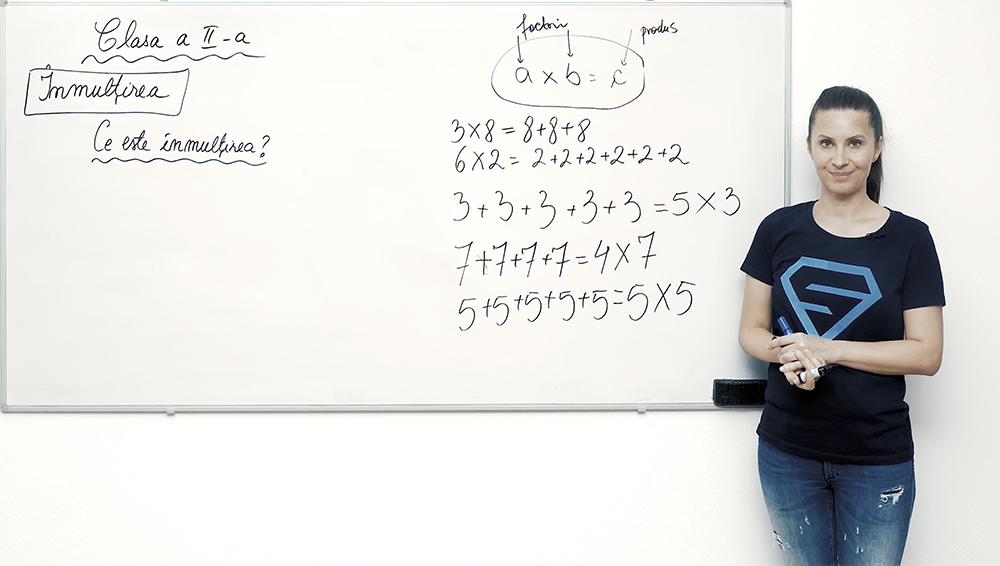 Video despre înmulțire și adunări repetate, învățând cum să transformi adunarea repetată în produs, cu explicații despre factori și produs. Elevii descoperă conceptul de înmulțire ca adunare repetată și învață să citească și să scrie operații de tip a × b, cu exemple video clare și motivante. Lecția explicativă oferă demonstrații pas cu pas și ajută copiii să înțeleagă concret ce reprezintă factorii, produsul și rolul simbolului ×.