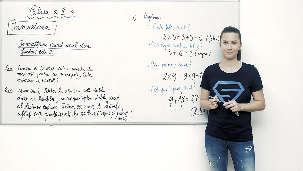 Video despre aplicarea înmulțirii cu doi în situații reale, cum ar fi tricotarea mănușilor, organizarea unei serbări și numărarea participanților. Lecția explică pas cu pas cum se calculează dublul numerelor în probleme descriptive, folosind adunarea repetată și ordinea factorilor pentru calcule rapide și corecte. Exemplele ajută copiii să vadă matematica în activitățile de zi cu zi.
