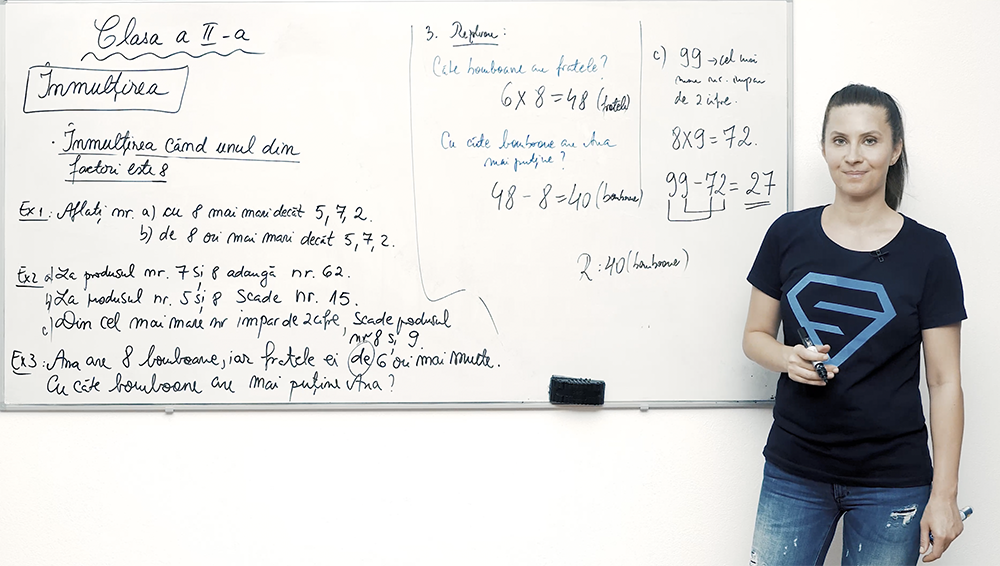 Înmulțire cu 8, adunare repetată cu 8, tabla înmulțirii cu 8, înmulțirea cu 8 proprietatea de comutativitate. Lecția video explică pas cu pas cum să folosești adunarea repetată și regula înmulțirii pentru a învăța rapid produsele cu 8. Exemple variate, inclusiv 8x8 și 8x9, sunt surprinse clar pentru a ajuta copiii să memoreze și să aplice cu încredere noile calcule.