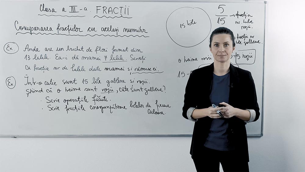 În continuarea lecției despre compararea fracțiilor cu același numitor, vei explora exemple suplimentare și situații diverse explicate pas cu pas. Lecția video prezintă noi exerciții practice, ilustrații și explicații despre semnele de comparație: mai mic, mai mare sau egal între numărători. Învață să compari cu ușurință orice pereche de fracții.