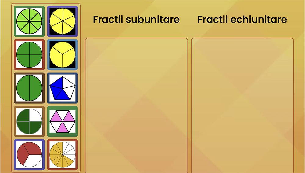 Jocul interactiv propune provocări cu fracții subunitare și echiunitare pentru a-ți testa înțelegerea acestor concepte. Aplicând noțiunile din lecția video, vei alege figurile care ilustrează corect când numărătorul este mai mic decât numitorul (fracție subunitară) sau egal cu acesta (fracție echiunitară). Activitățile vizuale și feedback-ul imediat te ajută să asimilezi rapid diferența dintre cele două tipuri de fracții într-o manieră distractivă și educativă.