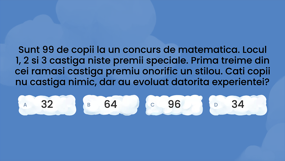 Jocul interactiv cu fracții îți pune la încercare abilitățile de calcul prin întrebări despre covrigi, crapi și premii. Vei răspunde la provocări multiple-choice și vei exersa fracțiile în contexte reale. Distractiv și educativ, acest joc te ajută să îți consolidezi cunoștințele despre fracții văzute ca părți dintr-un întreg. Grafica intuitivă și feedback instantaneu fac jocul captivant și ușor de folosit.