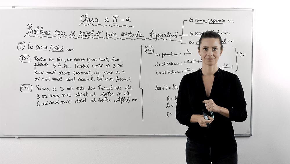 Metoda figurativă de rezolvare a problemelor cu segmente ajută elevii să vizualizeze pas cu pas exerciții de matematică. În acest videoclip interactiv, înveți să transformi datele problemei în segmente, să aplici adunarea, scăderea, înmulțirea și împărțirea pentru a obține răspunsul corect, aflând valoarea fiecărui segment, totul explicat simplu și prietenos.
