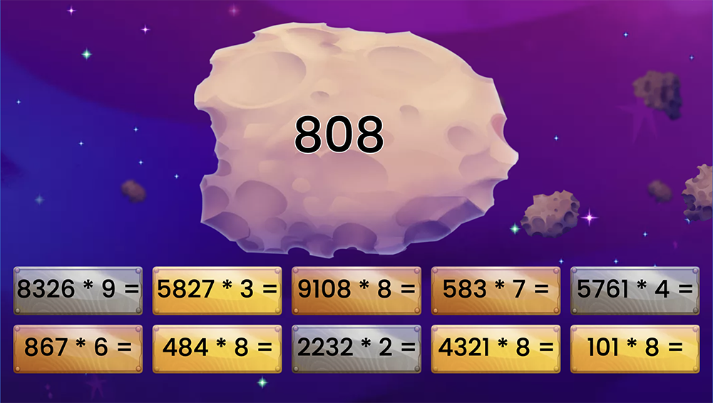 Înmulțirea și jocul în aceste exerciții de strategie invită copiii într-un joc interactiv în care aplică pașii înmulțirii numerelor de trei sau patru cifre cu o cifră. Fiecare problemă apare online cu feedback imediat pentru răspunsurile corecte sau greșite, iar cronometrul distractiv îi provoacă să rezolve cât mai rapid. Jocul include exerciții variate, niveluri de dificultate și puncte pentru răspunsurile exacte, motivând copiii să exerseze continuu.
