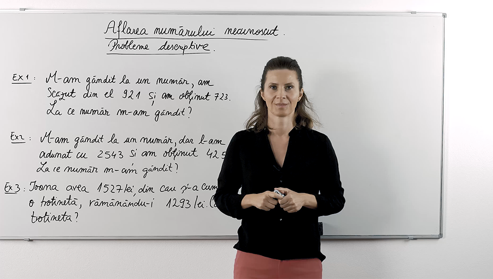 Rezolvarea problemelor descriptive, cu text și necunoscute sunt prezentate pas cu pas. În această lecție video înveți să transformi enunțuri cu poveste într-o ecuație clară și să afli valoarea termenului necunoscut, cu exemple precum trotineta Ioanei și numărul la care s-a gândit. Lecția oferă explicații simple și exerciții practice pentru consolidare.