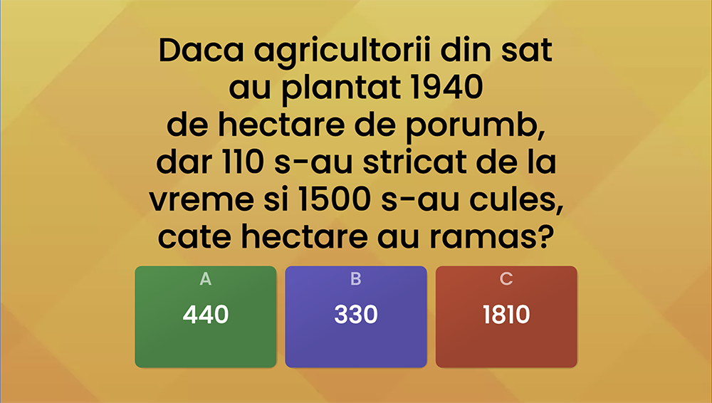 Joc interactiv, probleme descriptive, ecuații și aflarea termenului necunoscut transformă povești în exerciții captivante. În acest joc elevii întâlnesc situații cu agricultori, cumpărători și sume de lei, iar apoi aleg dintre mai multe variante pentru a afla termenul necunoscut, exersând formarea relațiilor și calculele necesare. Fiecare problemă oferă feedback imediat și stimulează gândirea logică.