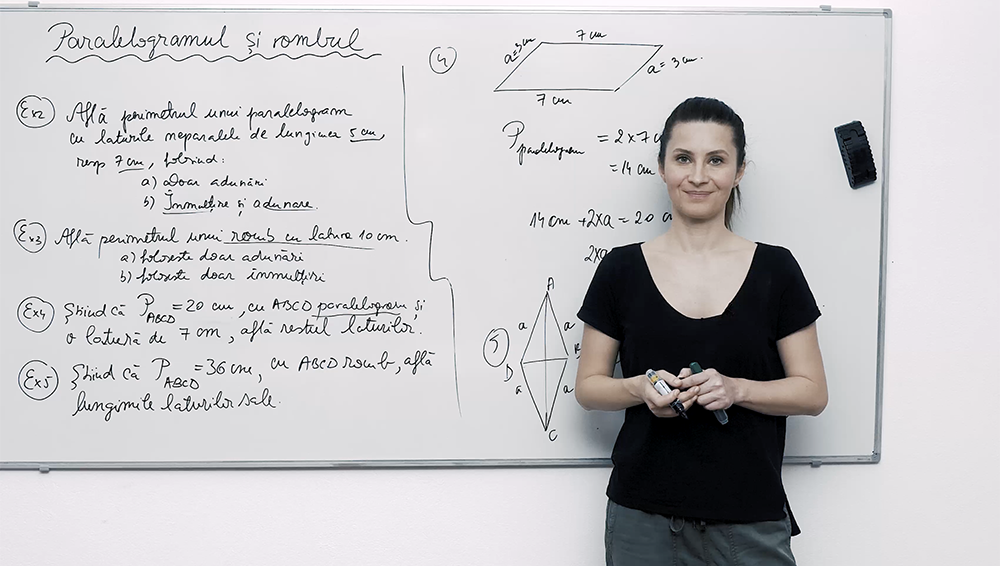 Elevii se familiarizează cu noțiunea de perimetru folosind paralelograme și romburi, învățând să adune lungimile laturilor și să folosească înmulțirea pentru calcule rapide. Lecția video explică formulele de bază, exemple explicite cu valori numerice și pașii de rezolvare, într-un limbaj simplu și atractiv pentru copii.