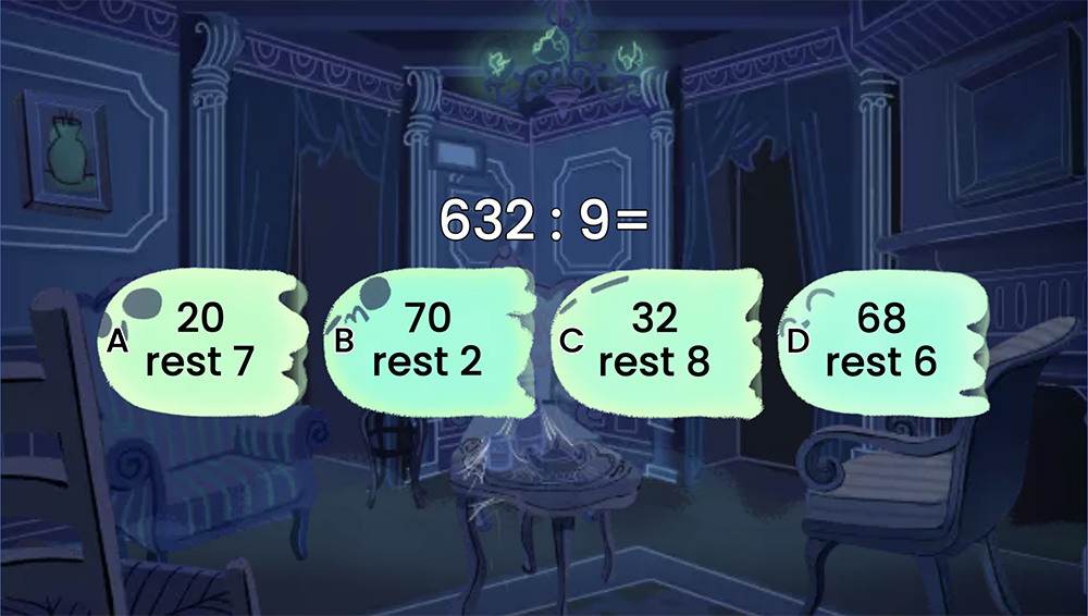 Rezolvă exerciții captivante cu împărțirea numerelor mari la un număr de o cifră. Jocul te provoacă să aplici metoda învățată și să găsești câtul și restul corect. Ideal pentru a exersa împărțirea scrisă într-un mod distractiv!