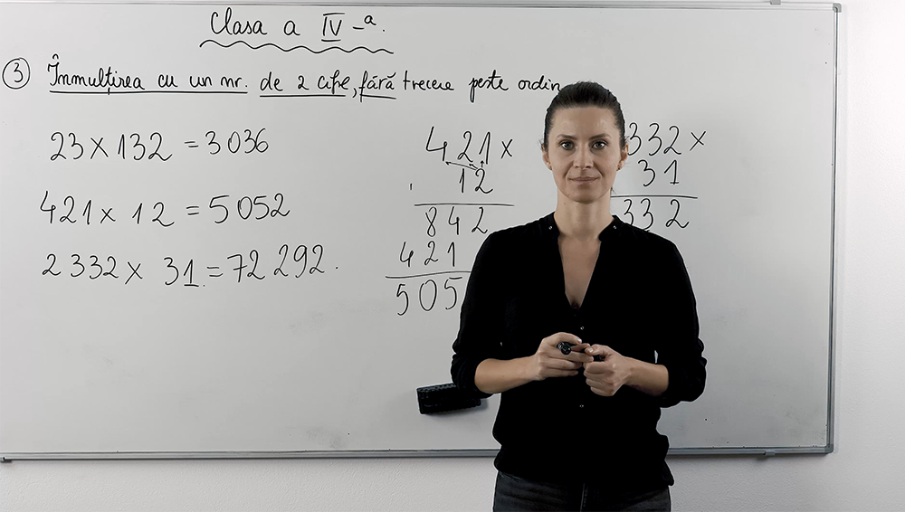 Lecția arată cum să înmulțești un număr cu un altul,de două cifre, fără trecere peste ordin, explicând fiecare pas de calcul și modul de organizare a cifrelor. Copiii urmăresc exemple clare cu numere de două cifre și învață să alinieze produsele parțiale, asigurându-se de calculul corect. Materialul video simplifică procesul prin grafice prietenoase.