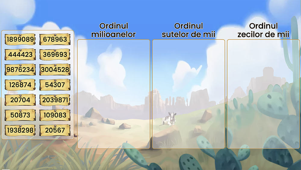 Joc interactiv de matematică în care exersezi formarea, citirea și scrierea numerelor până la un milion prin exerciții amuzante. Vei aranja cifrele în grupe de câte trei, vei citi numere mari și vei primi corecturi imediate. Distracția cuprinde niveluri progresive, perfect adaptate pentru consolidarea rapidă a abilităților.