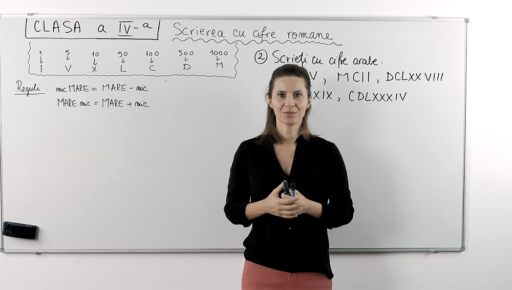 conversie cifre romane, cifre arabe, scriere și citire numere în ambele variante sunt detaliate cu exemple clare și pași simpli. Lecția video arată cum să descompui numerele în mii, sute, zeci și unități pentru a scrie corect în simboluri romane și cum să interpretezi scrierea in cifre romane pentru a le transforma în cifre arabe. Exercițiile exemplificate consolidează fiecare etapă a transformării.