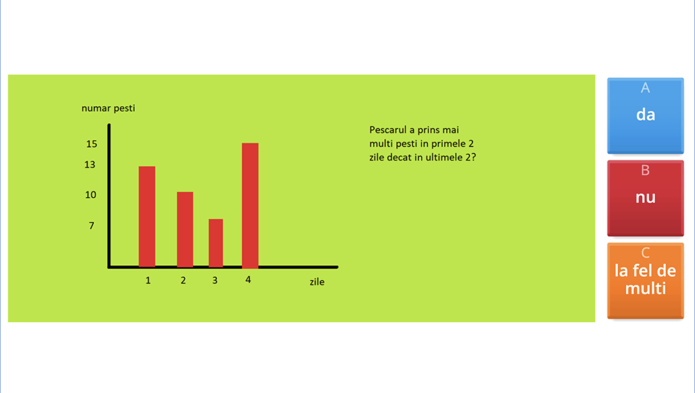 În jocul interactiv de organizare și interpretare a datelor elevii exersează citirea de tabele, grafice, diagrame. Prin activități practice, copiii calculează valoarea totală, compară valori între ele și răspund la întrebări despre valori maxime și minime. Feedback-ul imediat îi ajută să corecteze și să-și rafineze abilitățile de analiză a informației primite.