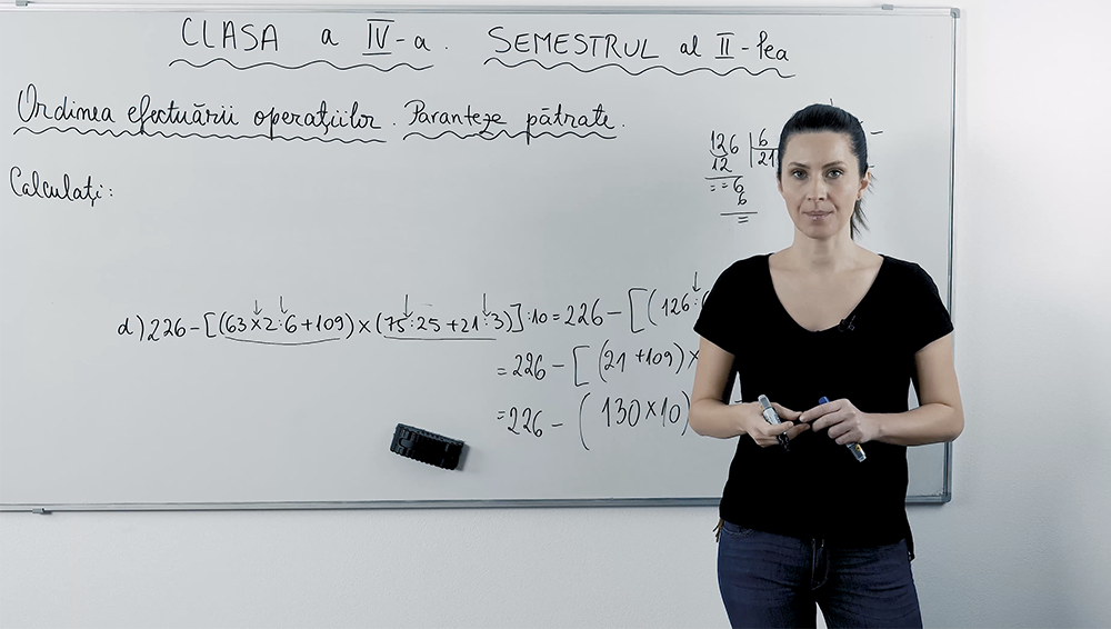 Paranteze pătrate, ordine operații și reguli clare pentru înmulțiri, împărțiri, adunări și scăderi explicate pas cu pas. În lecția video, copiii descoperă cum să rezolve întâi calculul din paranteze pătrate și rotunde, apoi să aplice ordinea corectă a operațiilor prin exemple detaliate și ușor de urmărit, cu explicații prietenoase și vizuale.