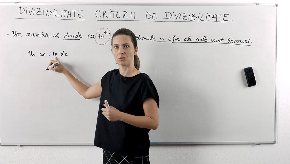 Divizibilitatea cu 10 la puterea n explorează cum aflăm rapid dacă un număr este divizibil cu 10, 100, 1 000 şi mai departe prin simpla verificare a zerourilor de la final. Lecţia prezintă paşii de gândire şi exemple clare, iar la final elevii pot exersa pe numere precum 2 790, 3 500 sau 42 816 pentru a fixa noţiunea într-un mod interactiv şi captivant.