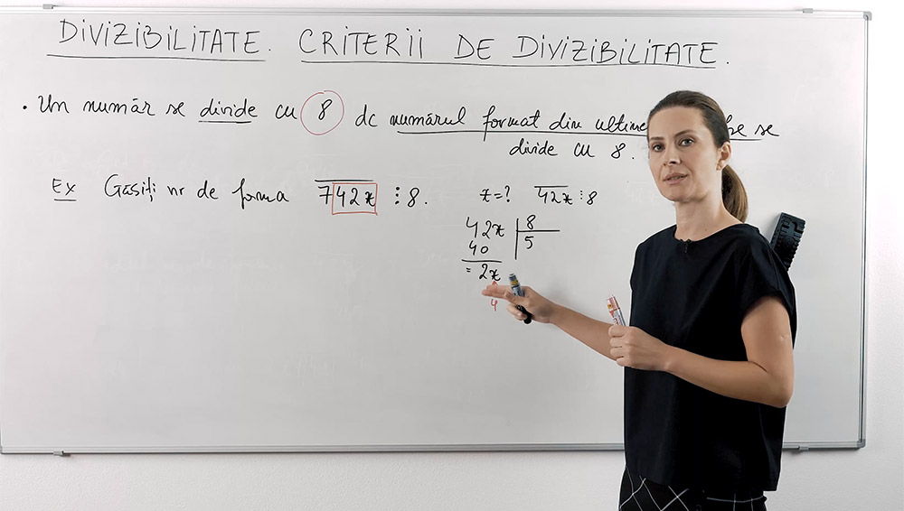 Divizibilitate numere, regula divizibilității cu 8 şi împărţirea exactă la 8 – învaţă cum să verifici uşor dacă un număr se împarte la 8, uitându-te la ultimele trei cifre ale sale. Lecţia video prezintă paşii esenţiali şi oferă exemple detaliate, astfel încât să înţelegi rapid regula şi să identifici numerele potrivite, consolidându-ţi logica matematică şi antrenându-ţi atenţia la detalii prin exerciţii practice.