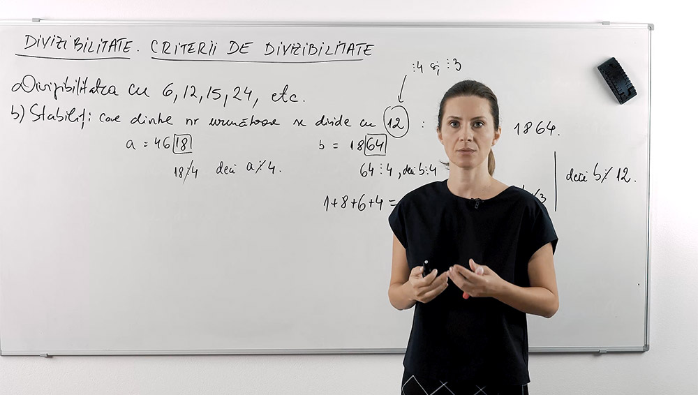 Divizibilitatea cu 6, 12, 15 sau 24 arată cum descompunem aceste numere în factori cunoscuţi (2, 3, 4, 5) şi aplicăm criterii multiple simultan. Lecţia oferă reguli clare pentru a recunoaşte rapid când un număr este divizibil cu 6 (2×3), cu 12 (4×3) sau cu 45 (9×5), folosind exemple practice pentru a fixa conceptele.