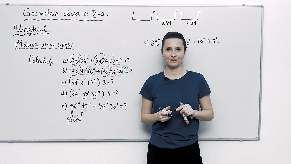 Gradele, minutele și secundele sunt unități pentru măsura unghiurilor; adunarea, scăderea și multiplicarea acestora implică transformări între ele. În acest video vei vedea cum aduni unghiurile 27°38′+38°40′, cum împarți sau înmulțești măsura unui unghi cu un număr și cum ajustezi rezultatul pentru ca minutele și secundele să fie sub 60. Exemple pas cu pas te ajută să stăpânești rapid operațiile de bază cu unghiuri, utile în geometria de gimnaziu.