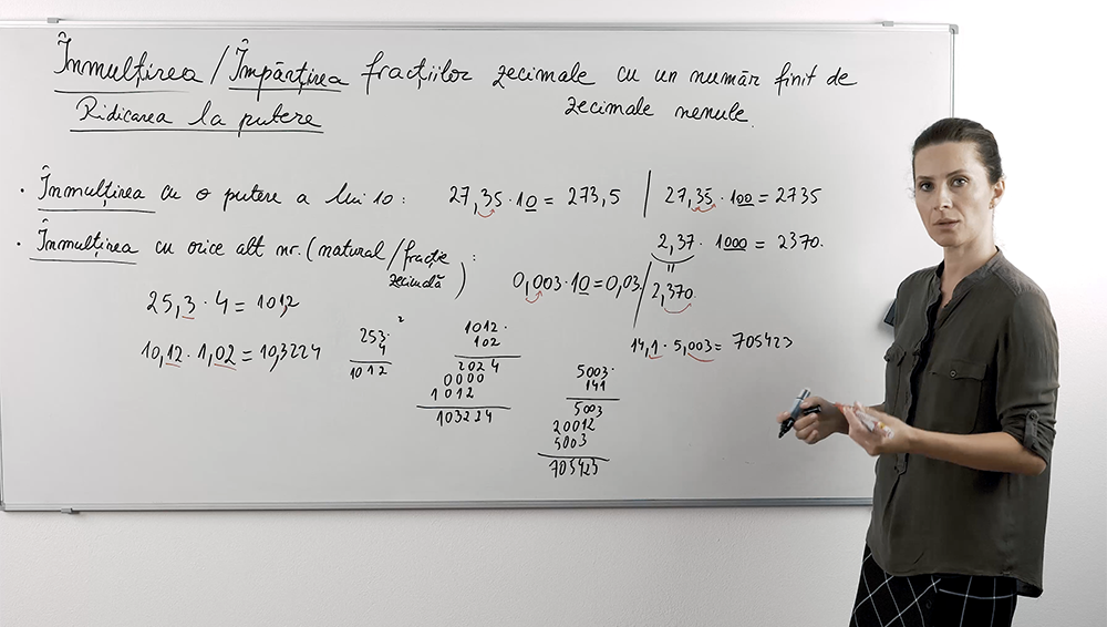 Descoperă cum se înmulțesc şi împart numerele zecimale cu puteri ale lui 10 sau cu alte zecimale, apoi cum se ridică la putere, exact ca numerele întregi. Vei muta virgula la dreapta când înmulțești cu 10, 100 sau 1000, vei aduna cifrele zecimale când înmulțești două fracții zecimale şi vei aplica regulile pentru operațiile cu puteri. Exemple ca 27,35×10, 25,3×4 sau (2,5)² te ajută să înțelegi ușor.