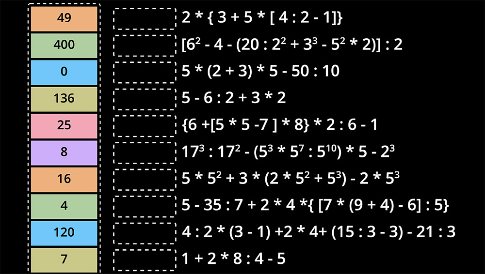 Joc interactiv pentru exersarea ordinii operațiilor: rezolvă expresii cu paranteze, puteri, înmulțiri și împărțiri, apoi adunări și scăderi. Alege pas cu pas rezultatul corect și primești feedback imediat. Înfruntă niveluri din ce în ce mai dificile care îți antrenează logica și atenția la detalii. Provocări amuzante și variate te ajută să-ți consolidezi rapid priceperea și să rezolvi orice expresie fără greșeală!