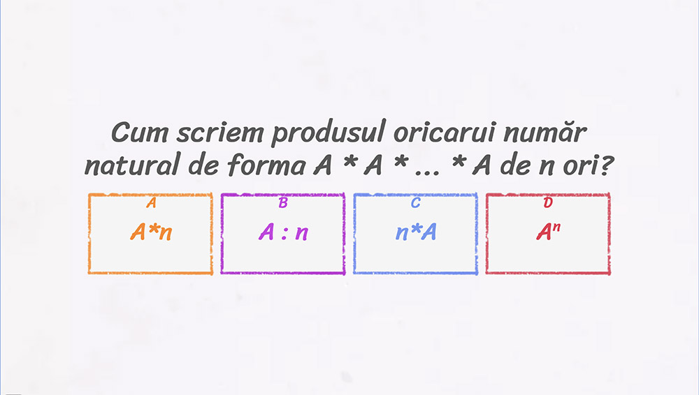 Joc interactiv de exersare a puterilor cu exponent natural: testează-ți abilitățile de a calcula “aⁿ“ și de a determina ultima cifră a rezultatelor. Provocările amuzante te ajută să îți consolidezi cunoștințele despre proprietățile puterilor și să devii rapid și sigur la aceste operații.