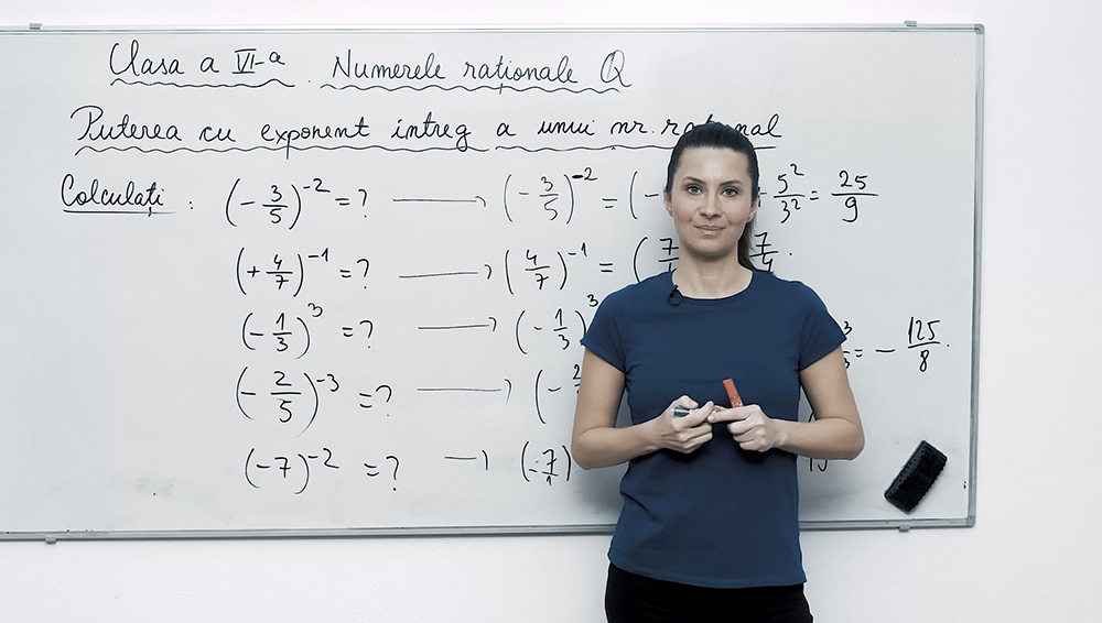 În această lecție video vei exersa combinarea operațiilor asupra numerelor raționale: puteri, înmulțiri și împărțiri. Înveți să scapi mai întâi de puterile cu semn negativ, apoi să folosești proprietățile exponenților pentru a aduna sau scădea puteri cu aceeași bază. Găsește exemple variate care îți arată cum să simplifici rezultatele prin aplicarea regulilor potrivite.
