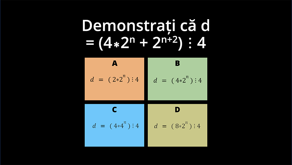 În acest joc de tip grilă selectează rapid varianta corectă pentru enunțuri de divizibilitate, demonstrații pentru diferite tipuri de enunțuri și găsirea lui n ∈ ℕ dintr-o relație de divizibilitate dată. Feedback-ul instant te ajută să recunoști rapid care factor comun sau proprietate a divizibilității (sumă, diferență, produs) se aplică și să îți testezi viteza și precizia. Jocul te motivează să devii maestru al proprietăților acesteia.
