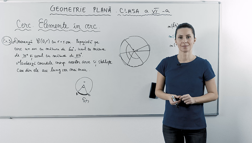 Află cum se măsoară arcul de cerc folosind unghiul la centru: lecția video arată pașii pentru a construi arce cu măsuri de 25°, 60° și 114° cu raportorul și compasul și explică cum le compari cu ajutorul desenului. Vei înțelege legătura dintre măsura unghiului la centru și lungimea arcului subîntins și vei exersa construirea lor precisă.