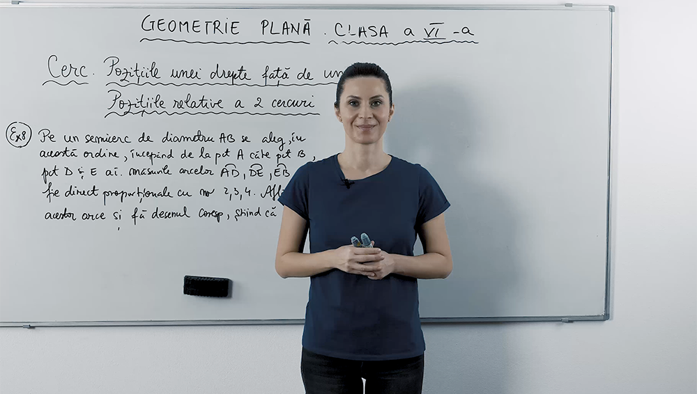 Arce cu măsuri proporționale, semicerc, rapoarte: această lecție video explică într-un limbaj simplu că dacă trei măsuri de arce, AD, DE și EB sunt direct proporționale cu numerele 2, 3, 4 pe semicercul unui cerc cu diametrul de 8 cm, putem afla măsurile acestora cu ușurință. Elevii învață să formuleze rapoartele de proporționalitate, să folosească proprietățile algebrice ale acestora, astfel reușind să afle măsurile arcelor și să le traseze precis cu raportorul.