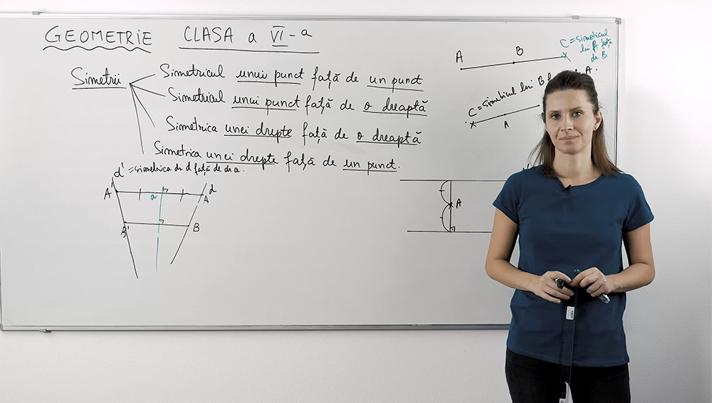 Simetria este ca o oglindă magică care îţi arată cum punctele şi dreptele se pot reflecta una în cealaltă: simetria punct-punct arată cum un punct „îl văd” în oglindă faţă de alt punct, iar simetriile punct-dreaptă şi dreaptă-dreaptă arată cum se proiectează acestea. În această lecţie video descoperi pas cu pas cum să construieşti simetricul unui punct faţă de punct, simetricul unui punct faţă de o dreaptă şi simetria unei drepte faţă de o dreaptă, cu exemple practice şi explicaţii clare pentru a deprinde rapid procedeul geometric.