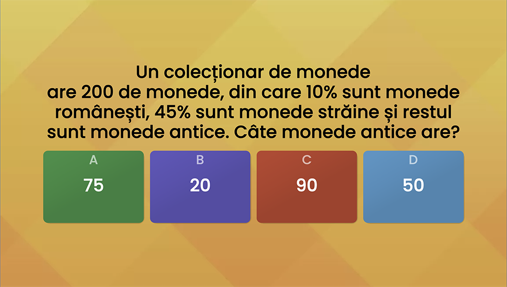 Joc interactiv procente și rapoarte cu probleme ce combină noțiunile în acest exercițiu captivant. Vei testa cunoștințele despre procente și rapoarte rezolvând provocări distractive. Fiecare nivel adaugă feedback instant și exemple practice, pentru a-ți motiva imaginația și a-ți verifica rapid abilitățile de calcul procentual într-un mod amuzant.