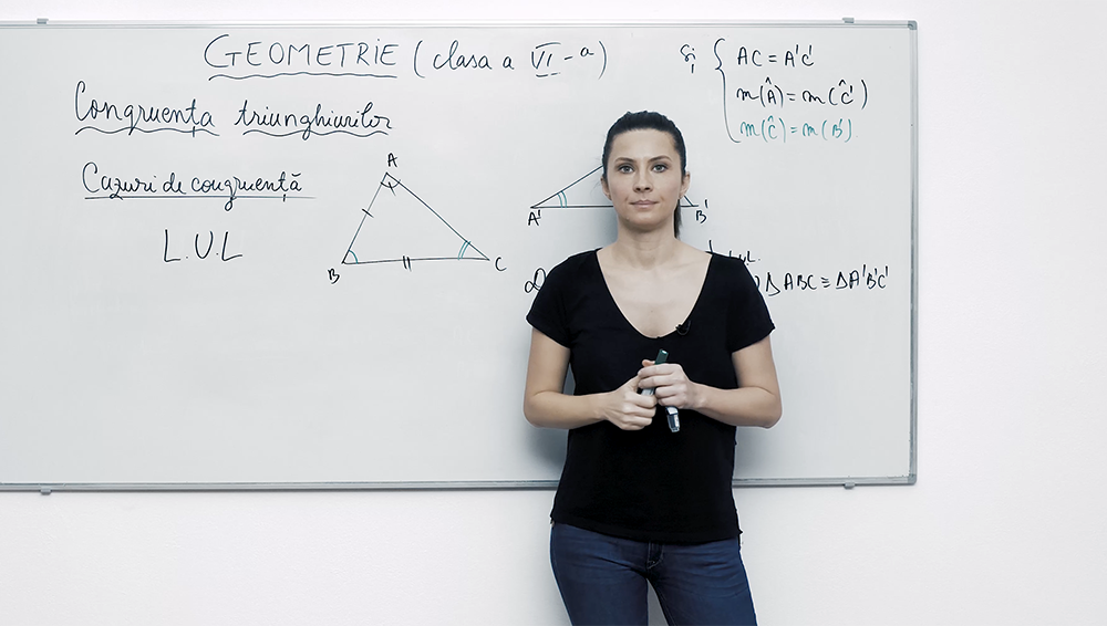 În această lecție video explorezi trei cazuri de congruență pentru triunghiuri: latură-latură-latură, unghi-latură-unghi şi latură-unghi-latură. Lecția explică pas cu pas cum se pot demonstra congruențele triunghiurilor folosind segmente și unghiuri omoloage, precum și modul de stabilire a corespondențelor între vârfuri și laturi.