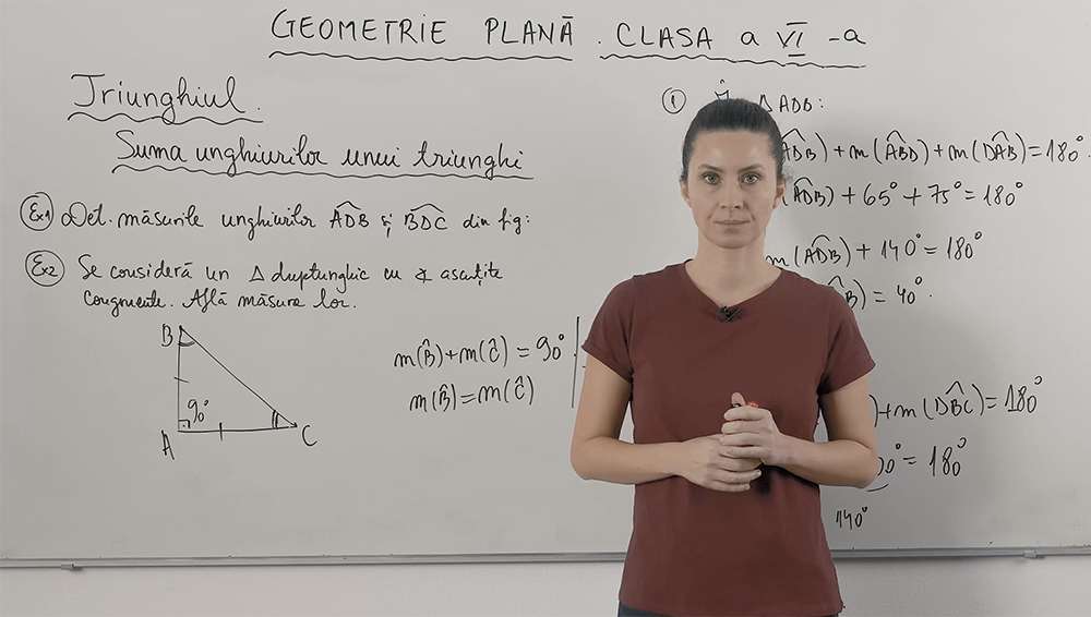 Triunghi, măsura unghiurilor în triunghi, probleme unghiuri. În această lecție video vei învăța pas cu pas cum să determini măsura unghiurilor necunoscute într-un triunghi dat. În primul exemplu calculezi rapid unghiurile interne cu formula sumei de 180°, iar în al doilea înveți despre triunghiul dreptunghic isoscel și cum unghiurile ascuțite însumează 90°. Lecția este ușor de urmărit și plină de explicații vizuale care îți consolidează înțelegerea proprietăților unghiurilor.