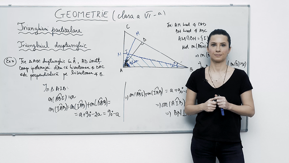 bisectoare, perpendicularitate, triunghi dreptunghic, unghi, mediana – în această lecție video înveți cum bisectoarele unghiului într-un triunghi dreptunghic pot fi perpendiculare. Prin notații clare și demonstrații cu litere, descoperi pas cu pas cum se obține unghiul de 90° din intersectarea bisectoarei unghiului drept și a bisectoarei unui unghi ascuțit. Explicațiile accesibile și exemplele vizuale îți dau încredere să aplici proprietăți avansate de geometrie.