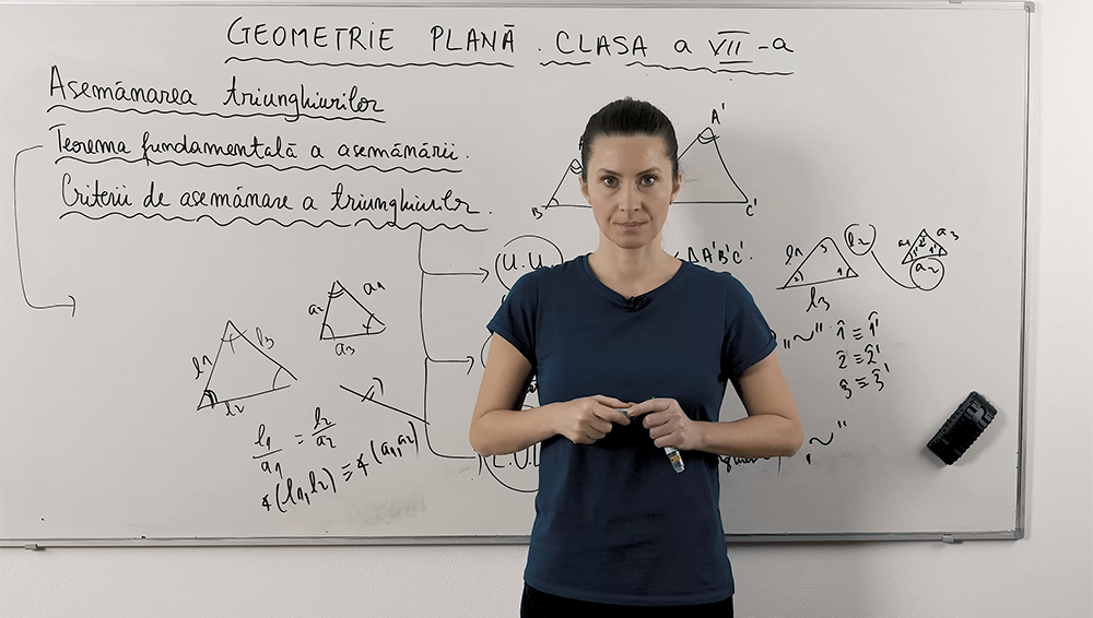 În lecția video înveți conceptele de triunghiuri asemenea: unghi-unghi, latură-latură-latură, latură-unghi-latură. Vei descoperi cum se definesc proporționalitatea laturilor omoloage și congruența unghiurilor și vei vedea cum Teorema fundamentală a asemănării explică legătura dintre paralela la o latură dintr-un triunghi și raporturile determinate astfel. Conținutul este adaptat elevilor de gimnaziu, cu exemple clare.