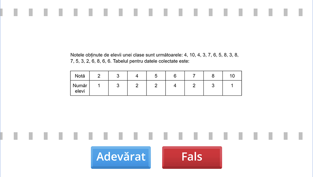Joc interactiv pentru verificarea înțelegerii tabelelor, diagramelor şi a graficelor! Răspunde la declarații Adevărat sau Fals privind frecvențele obținute de elevi, compară valori din tabele, recunoaşte formele poligonului frecvențelor şi interpretează datele din grafice. Feedback-ul imediat te ajută să corectezi rapid orice neclaritate şi să exersezi citirea corectă a informațiilor statistice.