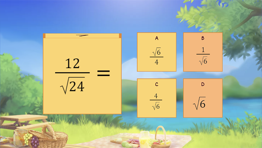 Testează-ți abilitățile de raționalizare a numitorului unei fracții și de transformare a exponenților întregi într-un joc interactiv captivant! Pornind de la lecția despre transformarea radicalilor și mutarea exponenților, vei alege variantele corecte pentru a elimina radicalii din numitor și a simplifica expresiile. Fiecare nivel te provoacă să răspunzi rapid și corect, consolidându-ți cunoștințele prin feedback instant și voie bună. Intră în joc și demonstrează că stăpânești formulele pentru radicali și exponenți!