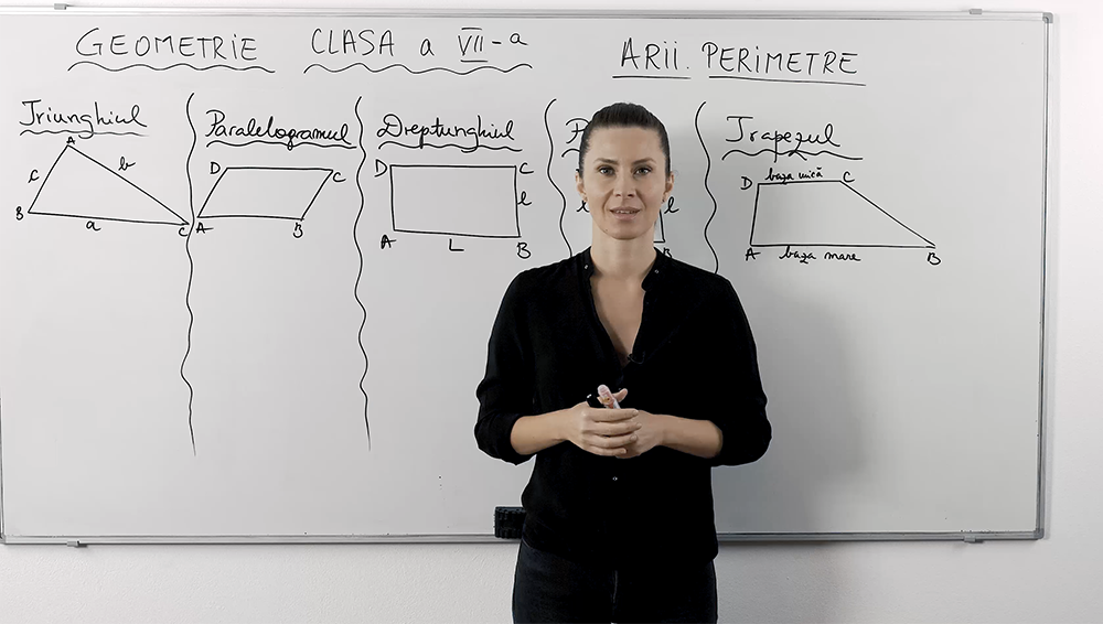 Arie, perimetru, triunghi, paralelogram și trapez – descoperi cum să calculezi rapid aria și perimetrul pentru toate cele cinci figuri de bază. În lecție explicăm pe rând formula Aria = (b · h)/2 pentru triunghi, A = b · h, respectiv A = L · l pentru paralelogram și dreptunghi, și A = (Baza mare + Baza mică) · h/2 pentru trapez, plus aria rombului din cele două diagonale. Perimetrele devin floare la ureche odată ce înțelegi structura fiecărui poligon.